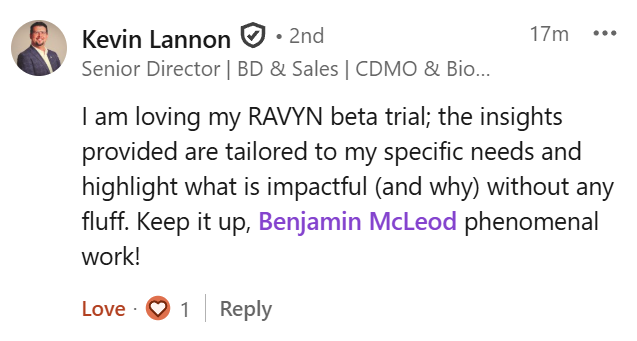 RAVYN continuously monitors the biotech news landscape, scores each signal against your custom profile, and surfaces only what matters — with personalized insight and clear next steps tied to your role and strategic goals.